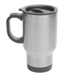 Stainless steel travel mug with a metal finish.