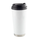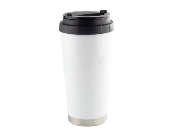 Stainless steel thermos with a white finish. Double walled and a leak proof cap. Height: 187mm, Printable Height: 140mm, Neck Diameter: 92mm, Base Diameter: 68mm, Mug Element: 17oz Latte
